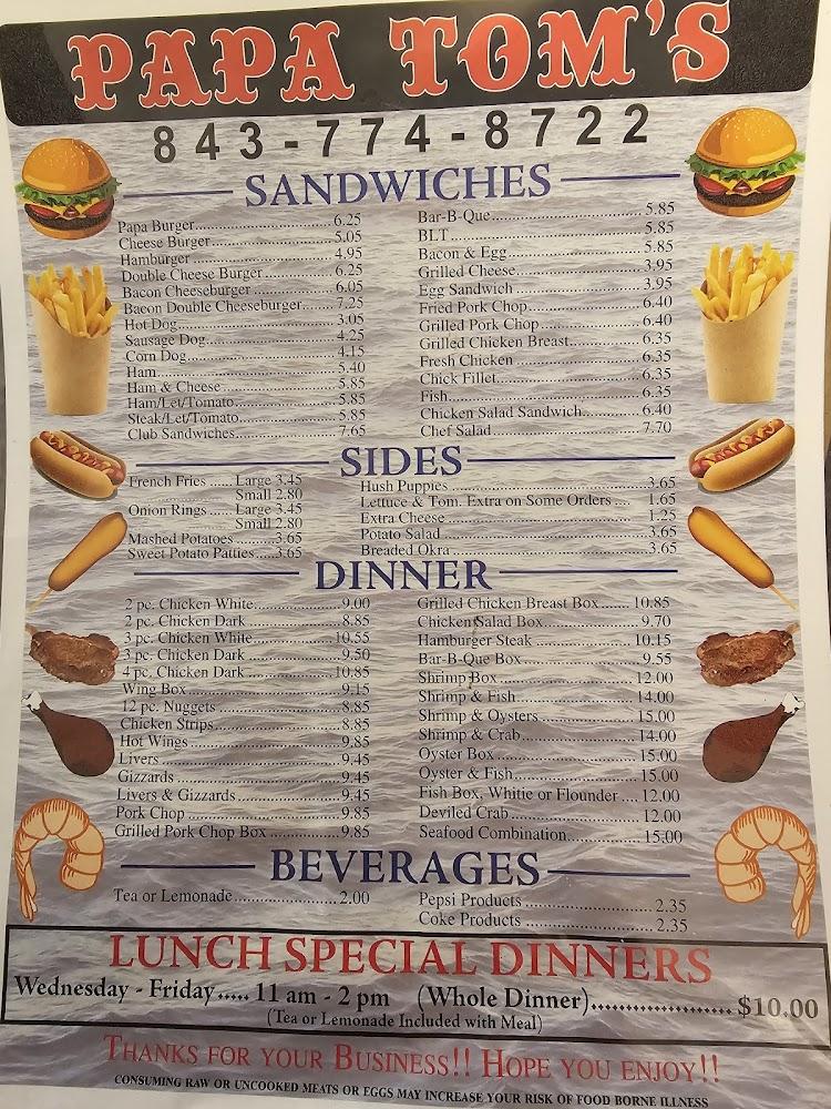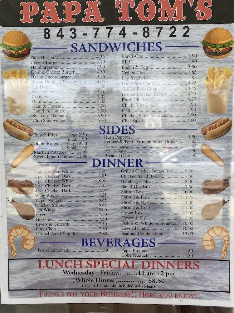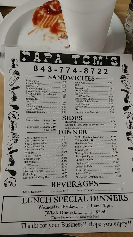 Welcome to Papa Tom's Drive In Restaurant, a cherished gem in the heart of Dillon, SC. Family-owned and operated, our restaurant serves up traditional American meals with a nostalgic twist. Enjoy a delightful variety of menu items, from hearty lunches to satisfying dinners, all in a relaxed and charming atmosphere. Our friendly service ensures a quick turnaround, making us a favorite spot for solo diners and groups alike. With accessible seating and a lovely outdoor terrace, you can savor local specialties or simply share small plates with loved ones. Visit us at 809 Martin Luther King Jr Blvd for a fulfilling, old-fashioned dining experience!